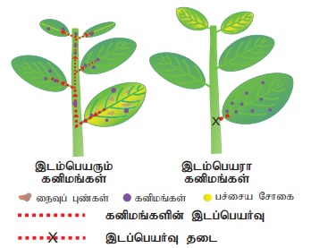நைட்ரஜன், பாஸ்பரஸ், பொட்டாசியம், மெக்னீசியம், குளோரின், சோடியம், துத்தநாகம் மற்றும் மாலிப்டினம் விரைவாக இடம்பெயரும் தனிமங்கள். இளம் இலைகளை நோக்கி தனிமங்கள் விரைவாக இடம்பெயர்வதால் பற்றாக்குறை அறிகுறிகள் முதிர்சியடைந்த, உதிரும் நிலையில் உள்ள இலைகளில் தோன்றுகிறது.