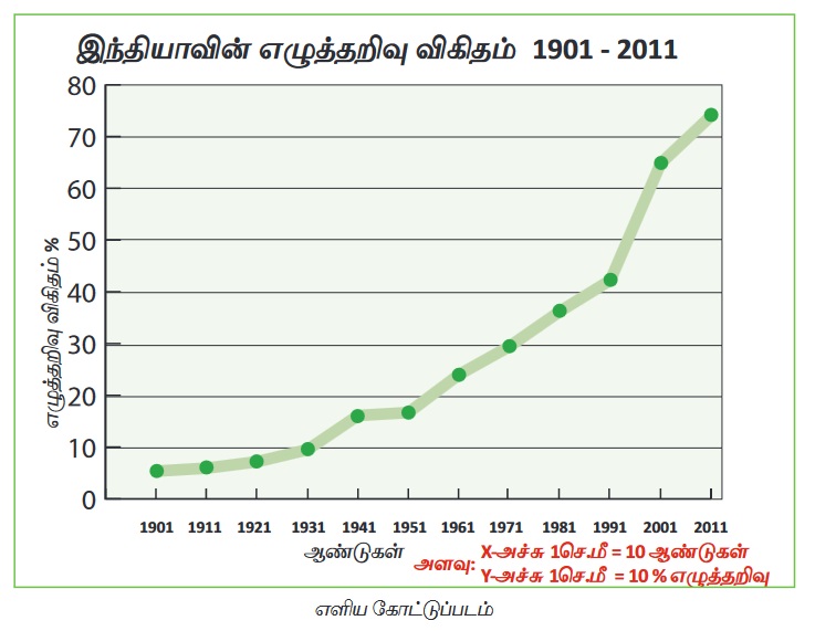 படி 3: செங்குத்து செவ்வக பட்டைகள், ஆண்டு குறிப்பிடப்பட்ட இடத்திற்கு மேல் ஒவ்வொரு ஆண்டுக்கும் வரையப்பட வேண்டும் மற்றும் அதன் உயரம் எழுத்தறிவு விகிதத்தின் எண்ணளவிற்கு விகிதாச்சாரத்தில் அமைக்க வேண்டும்.