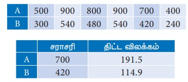 பின்வரும் அட்டவணையில் ஒரு பள்ளியின் பத்தாம் வகுப்பு மாணவர்களின் உயரம் மற்றும் எடைகளின் சராசரி மற்றும் விலக்க வர்க்க சராசரி ஆகிய மதிப்புகள் கொடுக்கப்பட்டுள்ளன.