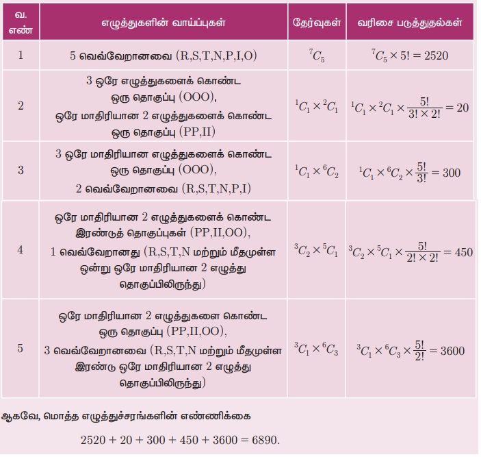 எடுத்துக்காட்டு 4.58 PROPOSITION எனும் வார்த்தையில் உள்ள எழுத்துகளை பயன்படுத்தி 5 எழுத்துகளில் எத்தனை எழுத்துச் சரங்களை உருவாக்கலாம்.