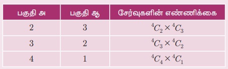எடுத்துக்காட்டு 4.56 ஒரு வினாத்தாளில் உள்ள 8 வினாக்களில் 4 வினாக்கள் பகுதி அ -விலும் 4 வினாக்கள் பகுதி ஆ-விலும் உள்ளன. தேர்வு எழுதுபவர் 5 வினாக்களுக்கு விடையளிக்க வேண்டும். கீழ்க்கண்ட நிபந்தனைகளை நிறைவுசெய்யும் வகையில் எத்தனை வழிகளில் இதனைச் செய்யலாம்