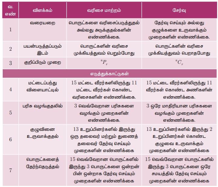 இயல்பாக வரிசை மாற்றம் மற்றும் சேர்வு பற்றி படிக்கும் எவருக்கும் ஒரு குழப்பம் வர வாய்ப்புள்ளது. எடுத்துக்காட்டுகளுடன் விளக்கப்பட்டுள்ள கீழ்க்காணும் அட்டவணையானது இத்தகைய குழப்பத்தை நீக்க பெரிதும் உதவி புரியும்.