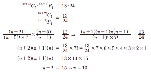 எடுத்துக்காட்டு 4.50 (n+2)C7 : (n-1)P4 = 13 : 24 எனில், n-ன் மதிப்பைக் காண்க.