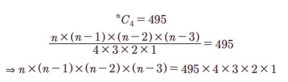 495ஐ காரணிப்படுத்த 495 = 3 × 3 × 5 × 11 மேலும், இந்த பெருக்கலை 4 அடுத்தடுத்த எண்களின் பெருக்கலாக இறங்கு வரிசையில் எழுத n × (n - 1) × (n - 2) × (n - 3) = 12 × 11 × 10 × 9 என பெறுகிறோம். n -ஐ பெரிய எண்ணுடன் சமப்படுத்த, n = 12 எனக் கிடைக்கும்.