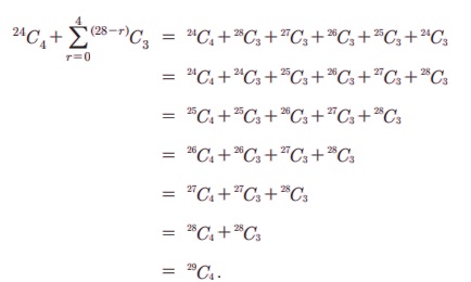 4. நிறுவுக 15C3 + 2 × 15C4 + 15C5 = 17C5.