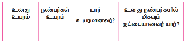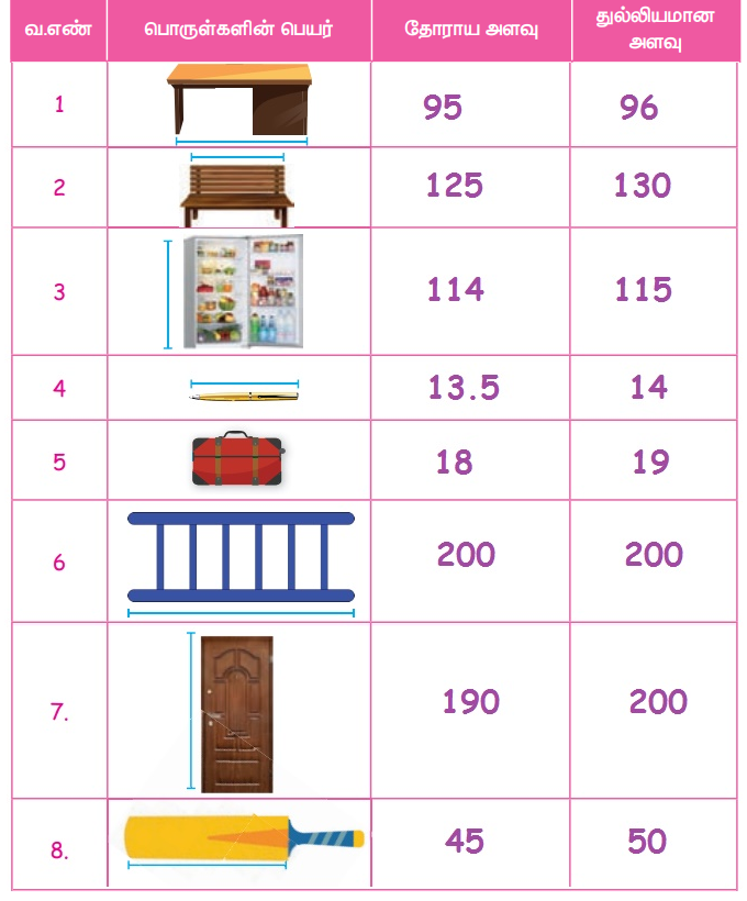 கொடுக்கப்பட்டுள்ள பொருள்களின் நீளத்தைப் தோராயமாக அளந்து பின்பு தரப்படுத்தப்பட்ட அளவு கொண்டு அளந்து சரி பார்.