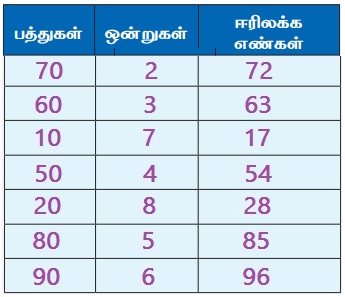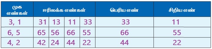 கொடுக்கப்பட்டுள்ள எண்களைப் பயன்படுத்தி அனைத்து ஈரிலக்க எண்களை உருவாக்கி அட்டவணையை நிறைவு செய்க.