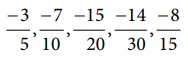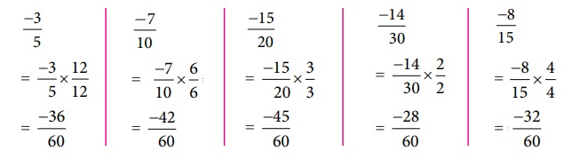 முதலில் பகுதிகளை மிகை எண்களாக மாற்றி என திட்ட வடிவில் எழுதவும். இங்கு, 5, 10, 15, 20 மற்றும் 30 ஆகியவற்றின் மீ.சி.ம 60 ஆகும் (கண்டுபிடிக்கவும்!). கொடுக்கப்பட்ட விகிதமுறு எண்களை 60 ஐப் பகுதியாகக் கொண்ட சமான பின்னங்களாக மாற்றவும்.