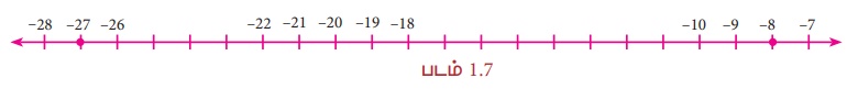 −8 ஆனது −27 இன் வலதுபுறமாக உள்ளது. ஆகவே, (−8) > (−27) ஆகும். இதனால் கிடைக்கும் முடிவானது ஆகும். ஆகவே,