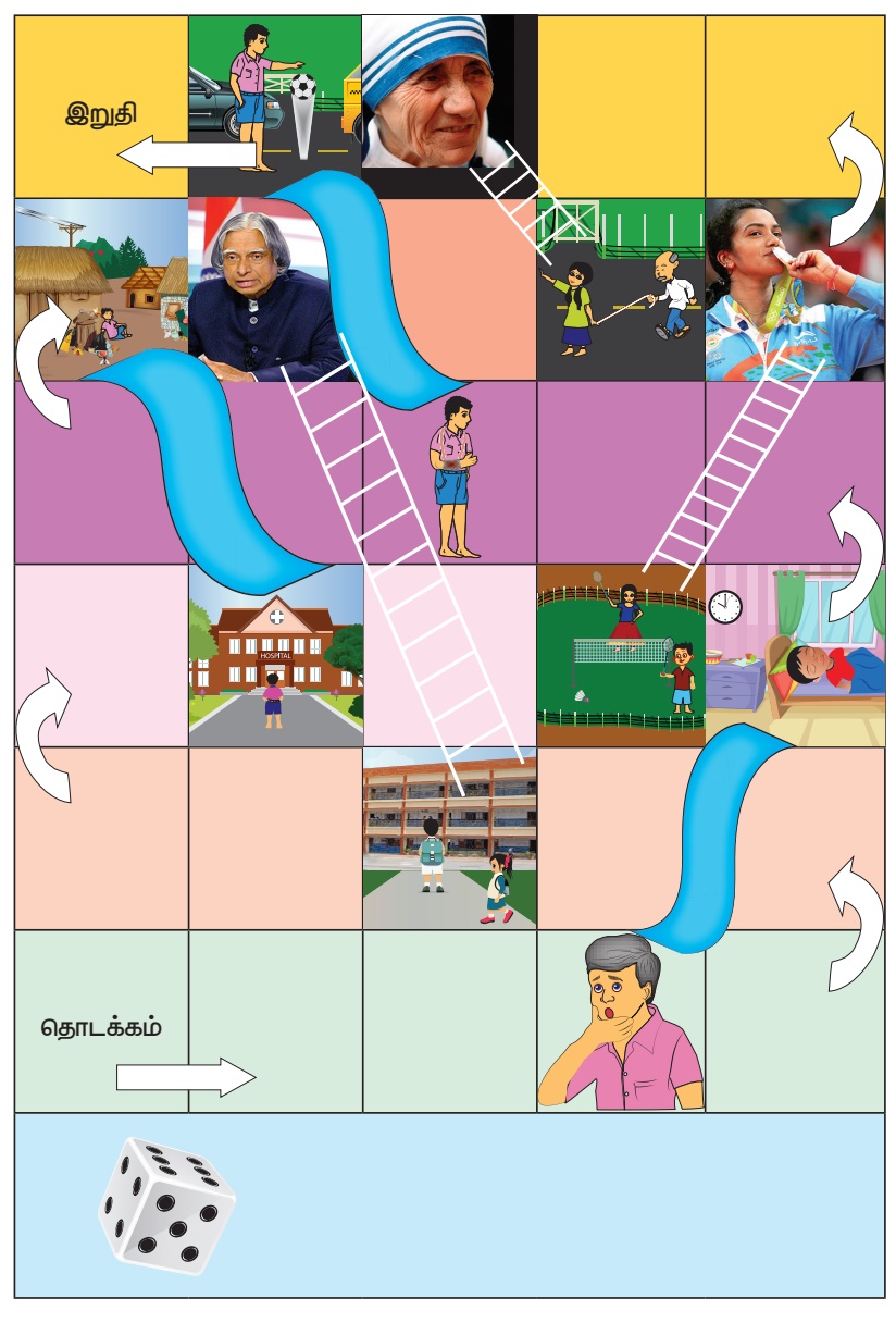 ஒவ்வொரு குழந்தையும் பகடை உருட்டிப் பெறும் எண்ணிற்கேற்பப் பொத்தானை ஏணிச் சறுக்குக் கட்டத்தில் ஆரம்ப நிலையில் இருந்து நகர்த்த வேண்டும்.