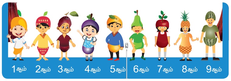 விழா மேடையில் நிற்கும் பழ வேடமணிந்த குழந்தைகளை உற்றுப் பார்.