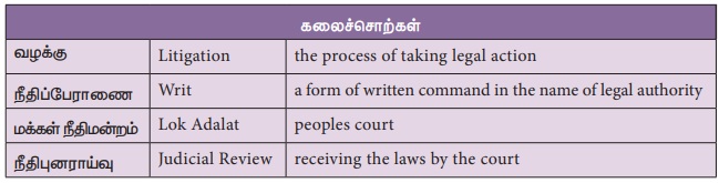 நீதித்துறை | அலகு 7 | குடிமையியல் | எட்டாம் வகுப்பு சமூக அறிவியல் - முடிவுரை, மீள்பார்வை, கலைச்சொற்கள் | 8th Social Science : Civics : Chapter 7 : The Judiciary