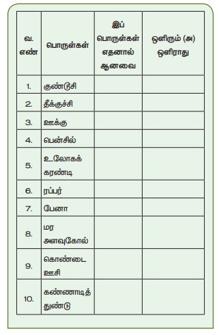 4: பட்டியலில் உள்ள பொருள்களை, A, B என்ற இருமுனைகளுக்கு இடையே இணைத்து, மின்விளக்கு