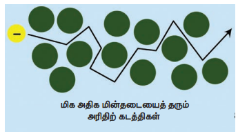 பொருள்களின் மின்கடத்தித் திறனானது கட்டுறா எலக்ட்ரான்களின் எண்ணிக்கையையும், அவை எவ்வாறு சிதறலடிக்கப்படுகின்றன என்பதையும் சார்ந்திருக்கும். இரப்பர் அழிப்பான் மின்னோட்டத்தை தன் வழியே செல்ல அனுமதிப்பதில்லை. எனவே, இரப்பர் ஒரு அரிதிற் கடத்தி ஆகும். பெரும்பாலான உலோகங்கள் மின்னோட்டத்தை தன் வழியே செல்ல அனுமதிக்கின்றன. அதேசமயம், பெரும்பாலான அலோகங்கள் மின்னோட்டம் தன் வழியே செல்ல அனுமதிப்பதில்லை .