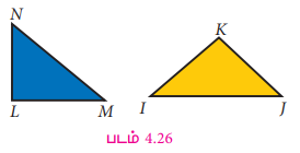 மேற்பொருத்தும் முறையில் ∆PQR (படம் 4.24) இன் மீது ∠L, ∠Q; ∠M , ∠R மற்றும் LM, QR என்றவாறு ∆LMN ஐப் பொருத்துக. இரு முக்கோணங்களும் மிகச் சரியாகப் பொருந்துவதைக் காணலாம்.