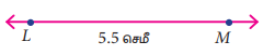 படி 1: ஒரு நேர் கோடு வரைக. LM = 5.5 செ.மீ உள்ளவாறு L மற்றும் M என்ற புள்ளிகளை அதன்மீது குறிக்க.