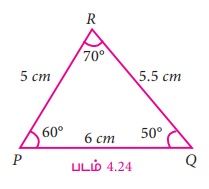 மேற்கண்ட முக்கோணத்திற்குச் சர்வசமமாக மற்றொரு முக்கோணத்தை வரைவதற்கு அனைத்து அளவுகளும் கொடுக்கப்படுதல் அவசியமா? முக்கோணத்தை வரைய மூன்று அளவுகள் மட்டுமே போதுமானதாகும். அம்மூன்று அளவுகள் பின்வருவனவற்றில் ஏதேனும் ஒன்றாக இருக்கலாம் (படம் 4.24).