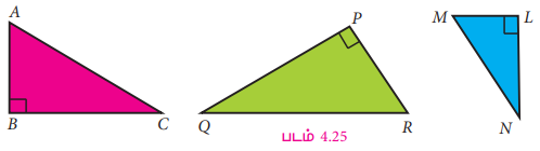 நாம், முந்தைய வகுப்பில் செங்கோண முக்கோணத்தைக் கற்றறிந்துள்ளோம். ஒரு செங்கோண முக்கோணத்தில், ஒரு கோணம் செங்கோணமாகவும் மற்ற இரு கோணங்கள் குறுங்கோணங்களாகவும் அமைந்திருக்கும். பின்வரும் செங்கோண முக்கோணங்களைக் கவனிக்க.