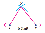 XY = 6 செ.மீ, YZ = 5.5 செ.மீ, மற்றும் ZX = 5 செ.மீ, என உள்ளவாறு ∆XYZ ஐ வரைக.