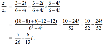 z1 =3 − 2i மற்றும் z2 = 6 + 4i எனில் z1 / z2 −ஐ செவ்வக வடிவில் காண்க.