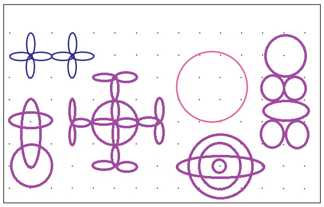 புள்ளி கட்டத்தில் புள்ளிகளை இனைத்து வளைகோடுகள் பயன்படுத்தி விருப்பம்போல் வடிவங்கள் (design) வரைக, உங்களுக்காக ஒன்று வரையப்பட்டுள்ளது.