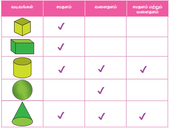 ஏதேனும் 5 வடிவங்களை கொடுக்கப்பட்டுள்ள பெட்டிகளில் வரையவும், வடிவத்திற்கு பயன்படுத்திய கோட்டை கொடுக்கப்பட்டுள்ள பெட்டிகளில் டிக் (✓) செய்யவும்