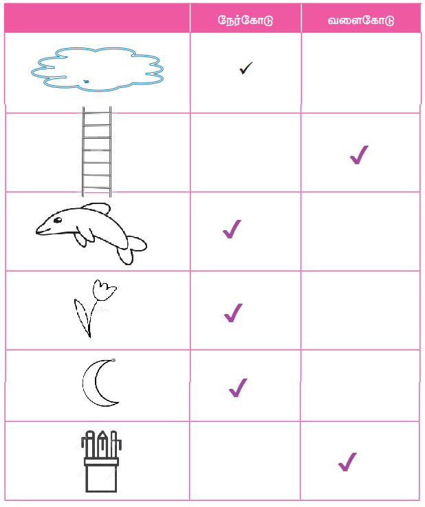 ஆசிரியர் குறிப்பு: அன்றாட பயன்பாட்டில் உள்ள பொருள்களில் காணப்படும் பல்வேறு வகையான கோடுகள் பற்றி கலந்துரையாடி மாணவர்களை மேலே உள்ள அட்டவனையில் வரையச்செய்யலாம்.