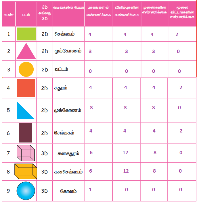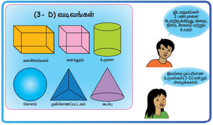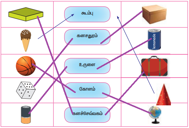 ஆசிரியர் குறிப்பு: ஆசிரியர், முப்பரிமாண (3D) பொருள்களை வரைய குழந்தைகளுக்கு வழிகாட்ட வேண்டும், மேலும், 3D வடிவங்களின் உண்மையான பொருள்களை கொடுத்து, குழந்தைகள் அதை தொட்டும், உணர்ந்தும் அதனுடைய தன்மைகளை கண்டுபிடிக்கக் கூற வேண்டும்,