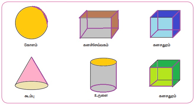 கனச்செவ்வகம், கனசதுரம், உருளை, கோளம், முக்கோணப்பட்டகம், கூம்பு
