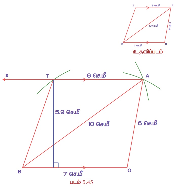 , BO = 7 செ.மீ, OA = 6 செ.மீ, BA = 10 செ.மீ மற்றும் TA = 6 செ.மீ அளவுகளைக் கொண்ட BOAT என்ற சரிவகம் வரைந்து, அதன் பரப்பளவைக் காண்க