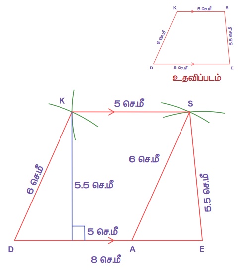 , DE = 8 செ.மீ, ES = 5.5 செ.மீ, KS = 5 செ.மீ மற்றும் KD = 6 செ.மீ அளவுகளைக் கொண்ட DESK என்ற சரிவகம் வரைந்து, அதன் பரப்பளவைக் காண்க.