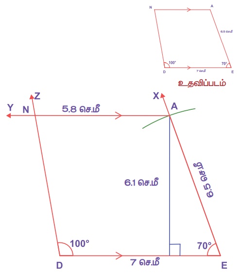 DE = 7 செ.மீ, EA=6.5 செ.மீ, ∠EDN = 100°,