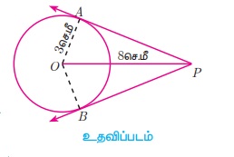 6 செ.மீ விட்டமுள்ள வட்டம் வரைந்து வட்டத்தின் மையத்திலிருந்து 8 செ.மீ தொலைவில் P என்ற புள்ளியைக் குறிக்கவும். அப்புள்ளியிலிருந்து PA மற்றும் PB என்ற இரு தொடுகோடுகள் வரைந்து அவற்றின் நீளங்களை அளவிடுக.