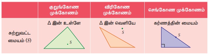 கொடுக்கப்பட்ட முக்கோணங்களுக்குச் சுற்றுவட்ட மையம் எங்கே அமையும் என்பதை அறிந்துகொள்ளுதல்.