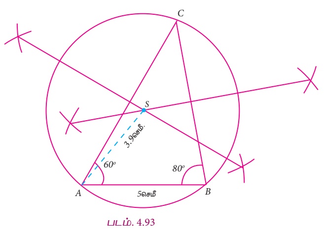 எடுத்துக்காட்டு, தீர்வு | வடிவியல் | கணக்கு - முக்கோணத்தின் சுற்றுவட்டமையம் வரைதல் (Construction of the Circumcentre of a Triangle) | 9th Maths : UNIT 4 : Geometry