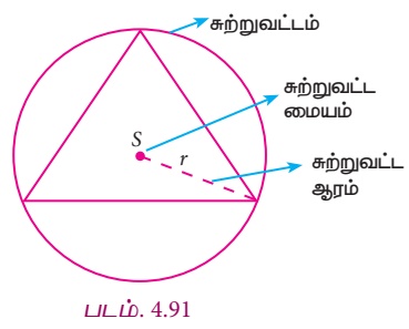 முக்கோணத்தின் ஏதேனும் ஓர் உச்சிப்புள்ளிக்கும் இடையே உள்ள தொலைவு சுற்றுவட்ட ஆரம் எனப்படும்.
