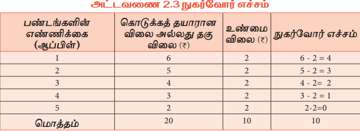 அட்டவணை 2.3-ல் நுகர்வோர் ₹6, 5, 4, 3 மற்றும் 2-ஐத் தொடர்ந்து அடுத்தடுத்த ஆப்பிள்களுக்குத் தர தயாராக உள்ளார். ஆப்பிள்களுக்காக ₹20ஐ அவர் தர தயாராக உள்ளார் (தகுவிலை). ஆனால் அவர் 5 ஆப்பிள்களுக்காக உண்மையில் கொடுத்த விலை ₹10 ஆகும் (₹2X5). எனவே