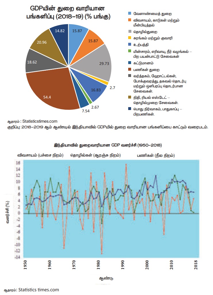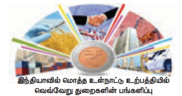 மொத்த உள்நாட்டு உற்பத்தி | பொருளியல் - இந்தியாவில் மொத்த உள்நாட்டு உற்பத்தியில் வெவ்வேறு துறைகளின் பங்களிப்பு | 10th Social Science : Economics : Chapter 1 : Gross Domestic Product and its Growth: an Introduction