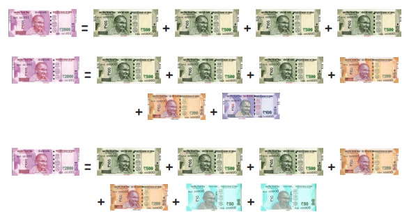 சங்கர் சுற்றுலா செல்ல தயாராகிக் கொண்டு இருக்கிறான். அவன் தன்னுடைய தந்தையிடம் ₹ 400 ஐ கைச் செலவிற்காக கேட்டான். தன்னுடைய பர்ஸில் ரூபாய் 2000 நோட்டுகள் மட்டுமே இருந்ததைக் கண்டார். உடனே கடைக்குச் சென்று ₹ 2000 இக்கு சில்லறையைப் பெறுகிறார்.