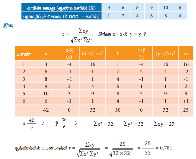 உதாரணம் 1 : பின்வரும் விவரங்களுக்கு உண்மைச் சராசரியை பயன்படுத்தும் சூத்திரத்தினை பயன்படுத்தி கார்ல் பியர்ஸனின் ஒட்டுறவுக் கெழுவினை கண்டறிக