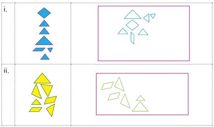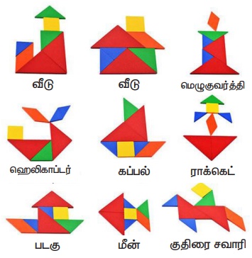 1. புதிர்வெட்டு துண்டுகள் (Tangram) கொண்டு வெவ்வேறு இருபரிமாண (2D) வடிவங்களை உருவாக்குதல்