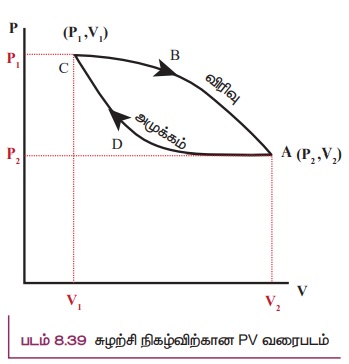 வாயுவானது சுழற்சி நிகழ்வினை மேற்கொள்கிறது எனக்கருதுக. இந்நிகழ்வில் வாயு ஒரு விரிவு மற்றும் ஒரு அமுக்கத்திற்குப் பின்வு தனது தொடக்க நிலையை படம் 8.39 இல் காட்டப்பட்டுள்ளவாறு அடைகிறது.
