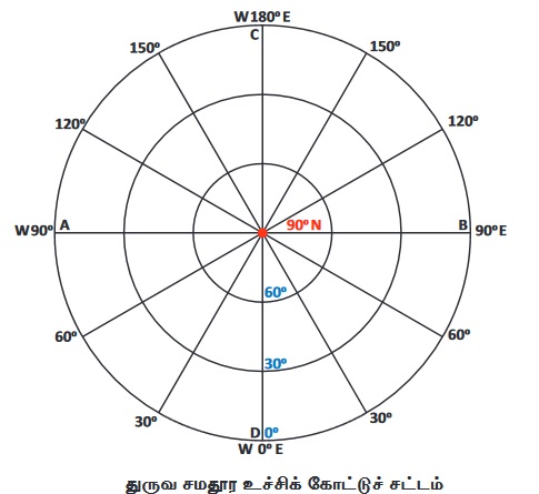 • துருவம் உச்சி கோட்டுச் சட்டத்தில் மையமாகவும் மற்றும் அட்ச ரேகைகள் ஒரு மைய வட்ட வளையங்களாகவும் காணப்படுகின்றன.