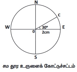 • பாகைமானியை பயன்படுத்தி 30° கோண அளவை கொண்டு மற்ற தீர்க்க ரேகைகளை குறிக்க வேண்டும்.