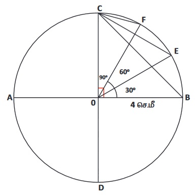 • 30°, 60 மற்றும் 90° என்ற கோண அளவுகளை குறித்து OE, OF, OC என்று குறிக்க வேண்டும். பிறகு, CB, CE மற்றும் CFவை நேர்கோடுகளாக இணைக்க வேண்டும்.
