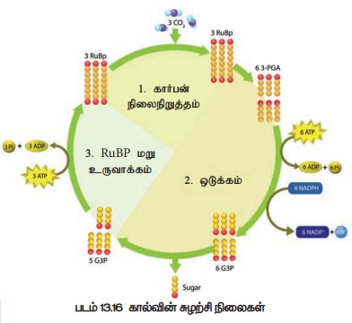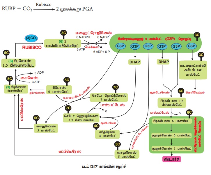 ஏற்பி மூலக்கூறான ரிபுலோஸ்1, 5 பிஸ் பாஸ்பேட் (RUBP) ஒரு 5 கார்பன் கூட்டுப்பொருள். இது RUBP கார்பாக்ஸிலேஸ் ஆக்ஸிஜினேஸ் (RUBISCO) நொதியின் உதவியால் ஒரு கார்பன்-டைஆக்ஸைட் மூலக்கூறுடன் இணைந்து இரு மூலக்கூறு 3 - கார்பன் கூட்டுப் பொருளான பாஸ்போகிளிசரிக் அமிலத்தை (PGA) உற்பத்தி செய்கிறது. (படம் 13.17)