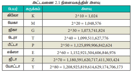 அட்டவணை பல்வேறு நினைவக அளவுகளைக் காட்டுகிறது.