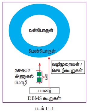 2. மென்பொருள்: அனைத்தையும் கட்டுப்படுத்தும் மிக முக்கியமான நிரலின் கூறு ஆகும். DBMS மென்பொருளானது தரவுத்தள அணுகல் மொழிகளைப் புரிந்து கொள்ள மற்றும் இயக்கத்திற்கான தரவுத்தள கட்டளைகளை நிரல் பெயர்க்க தகுதி வாய்ந்தது.