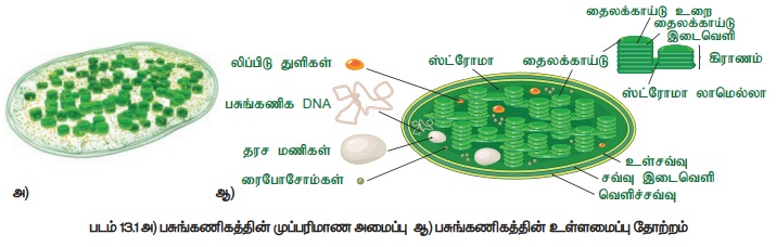 பசுங்கணிகம் ஒளிச்சேர்க்கை நடைபெறும் இடம் ஆகும். ஒளிச்சேர்க்கை நிகழ்வின் ஆற்றல் உருவாக்கும் வினையான ஒளி வினையும் (Light reaction) கார்பனை நிலைநிறுத்தம் செய்யும் இருள்வினையும் இங்கு நடைபெறுகிறது. பசுங்கணிகம் ஒரு வட்டுவடிவ (அ) லென்ஸ் வடிவ, இரட்டை சவ்வினால் ஆன செல்நுண்ணுறுப்பாகும். 4-10µm விட்டமும் மற்றும் 1-33 µm தடிமனும் உடையது. இதன் இரு சவ்வுகளும் ஓரலகு சவ்வாக செயல்படுகிறது. இரண்டு சவ்வுகளுக்கு இடைப்பட்ட இடைவெளி 100 முதல் 200 A° ஆகும். பசுங்கணிகத்தின் உள்ளே காணப்படும் கூழ் போன்ற, புரதத் தன்மையுடைய திரவத்திற்கு ஸ்ரோமா என்று பெயர்.