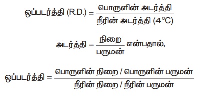 வெப்பநிலையில் அதே பருமனைக் கொண்ட நீரின் நிறைக்கும் இடையே உள்ள விகிதத்தையும் குறிக்கிறது.